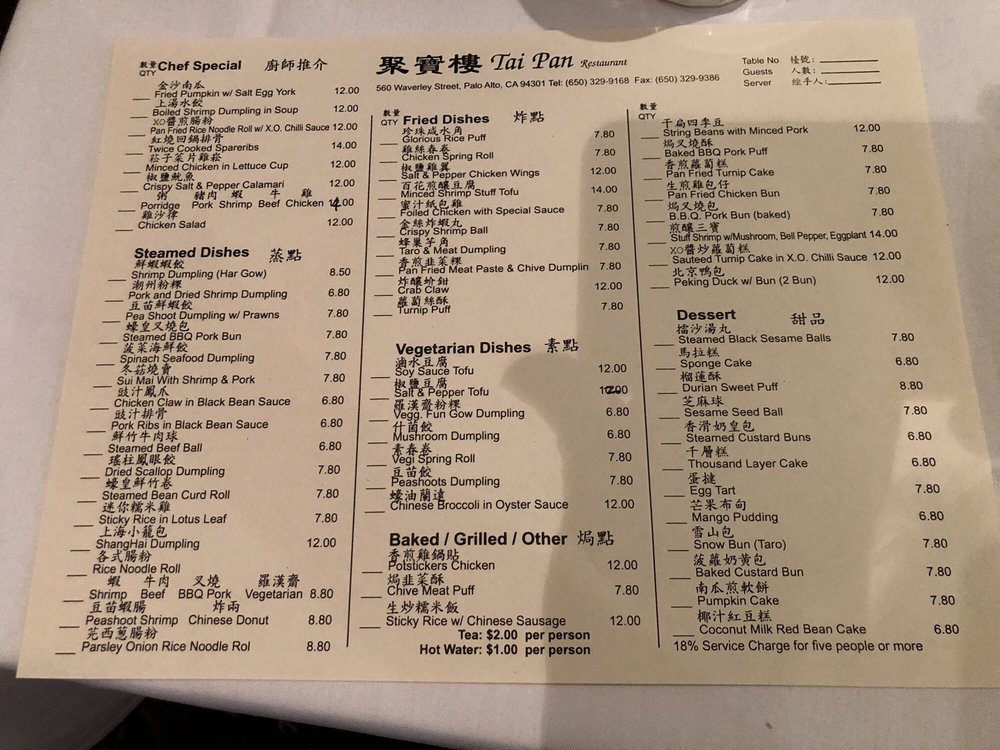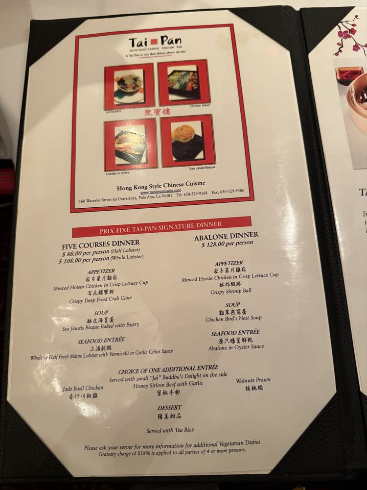 Welcome to Tai Pan, Palo Alto's splendid destination for authentic Chinese dim sum and delightful dishes. The menu highlights an array of culinary gems, showcasing quality ingredients and exquisite flavors. Signature dishes such as the Boiled Shrimp Dumpling in Soup and the Crispy Salt & Pepper Calamari are sure to captivate your taste buds.